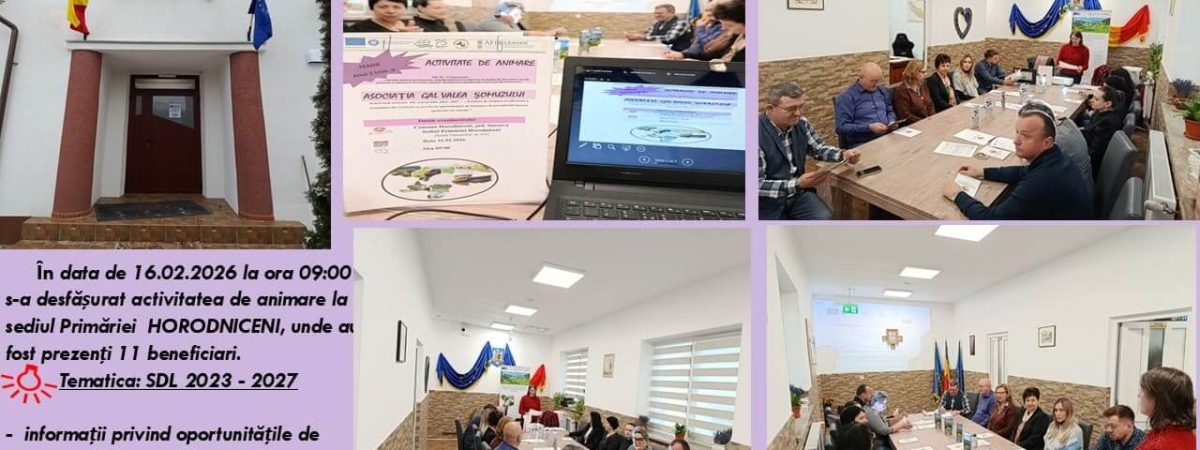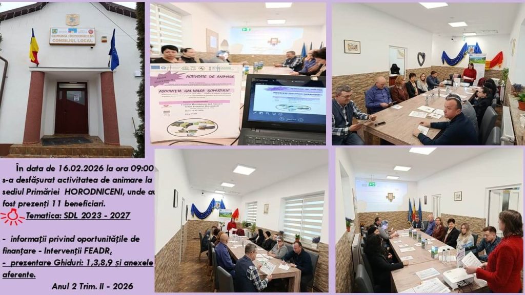 Echipa GAL Valea Șomuzului a desfășurat în comuna Horodniceni, pe 16 februarie 2026, sesiunea ”Întâlniri de animare organizate în preambulul lansării Apelurilor de Selecție” în cadrul Strategiei de Dezvoltare Locală 2023-2027” DR 36 – FEADR, aferentă trimestrului II, anul 2 implementare.