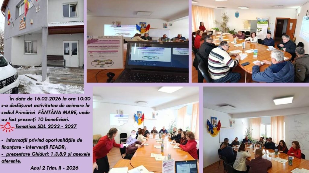 Echipa GAL Valea Șomuzului a desfășurat în comuna Fântâna Mare, pe 16 februarie 2026, sesiunea ”Întâlniri de animare organizate în preambulul lansării Apelurilor de Selecție” în cadrul Strategiei de Dezvoltare Locală 2023-2027” DR 36 – FEADR, aferentă trimestrului II, anul 2 implementare.
