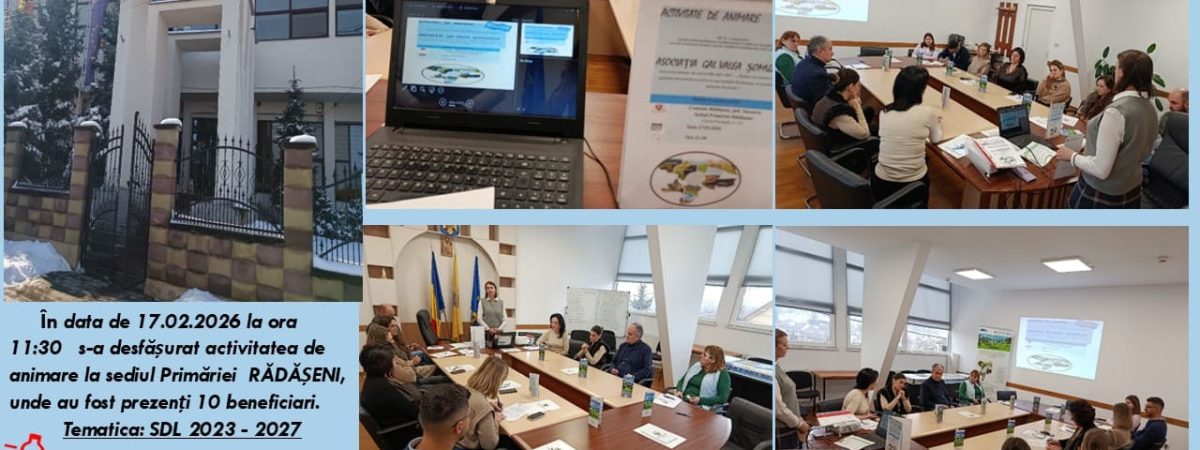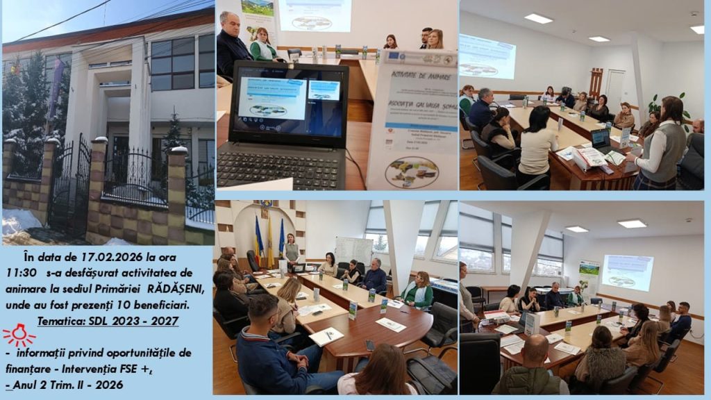 Echipa GAL Valea Șomuzului a desfășurat în comuna Rădășeni, pe data de 17 februarie 2026, sesiunea ”Întâlniri de animare organizate în preambulul lansării Apelurilor de Selecție” în cadrul Strategiei de Dezvoltare Locală 2023-2027” FSE+, aferentă trimestrului II, anul 2 implementare.
