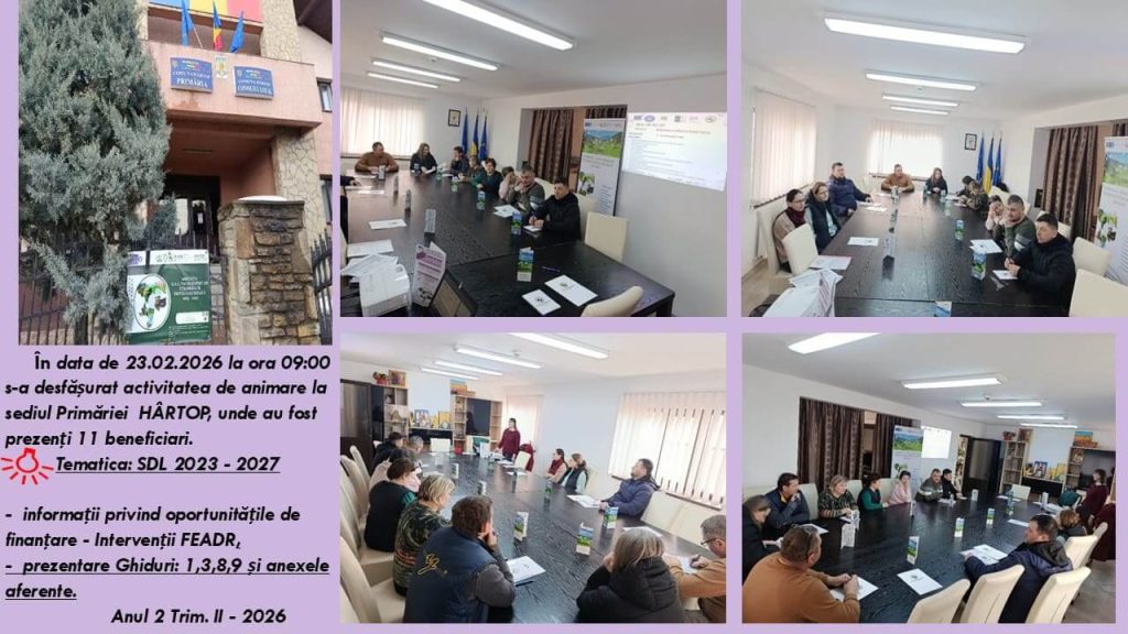 Echipa GAL Valea Șomuzului a desfășurat în comuna Hârtop, pe data de 23 februarie 2026, sesiunea ”Întâlniri de animare organizate în preambulul lansării Apelurilor de Selecție” în cadrul Strategiei de Dezvoltare Locală 2023-2027” DR 36 – FEADR, aferentă trimestrului II, anul 2 implementare.