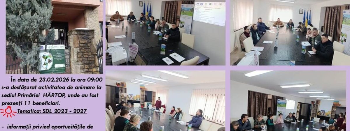 Echipa GAL Valea Șomuzului a desfășurat în comuna Hârtop, pe data de 23 februarie 2026, sesiunea ”Întâlniri de animare organizate în preambulul lansării Apelurilor de Selecție” în cadrul Strategiei de Dezvoltare Locală 2023-2027” DR 36 – FEADR, aferentă trimestrului II, anul 2 implementare.